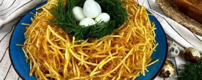 Alkuperäinen salaatti ”Grouse’s Nest” tai ”Quail’s Nest” on ihanteellinen muunnelma siitä, mitä valmistaa lomalle. Resepti on mutkaton ja kaikkien saatavilla. Ja tulos on niin maukas, että kukaan ei kieltäydy täydennyksestä.