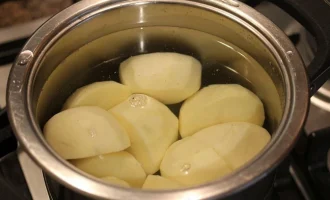 - Kuori perunat ja laita ne kiehumaan. Kaada 1 litra öljyä paistinpannuun kuumaksi. Kuumenna uuni 180 asteeseen.